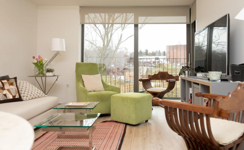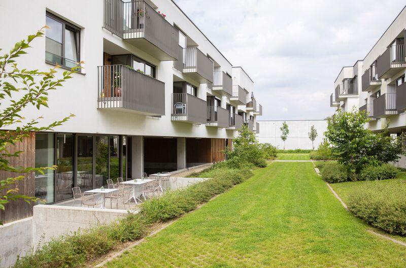 Chaque appartement dispose d'un grand salon, d'une chambre à coucher modulable, d'une cuisine équipée, de sanitaires adaptés et d'une terrasse extérieure avec vue sur le jardin commun.